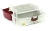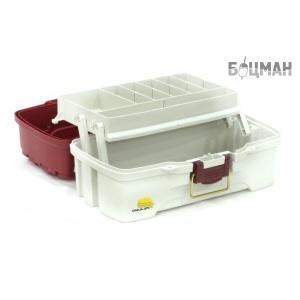 Рыболовный ящик с одноуровневой системой хранения приманок.Семь отделений с шестью съемными перегородками сверху и одно просторное отделение снизу ящика.Два небольших отделения на защелках в крышке ящика.Удобная складная ручка. В крышке снаружи 2 отделения габаритами 14,5 х 4 х 2 см. В основном отделении 1 полка у которой 5 отделений габаритами 11 х 3,8 х 3,8 см, 1 отделение габаритами 11 х 8,6 х 3,8 и 1 отделение габаритами 28,4 х 3,6 х 3,8 см.В комплекте 6 съемных разграничителей. Габариты основного отделения: 33,5 х 16,5 х 9,5 см. Габариты ящика: 35 х 20,5 х 19см.