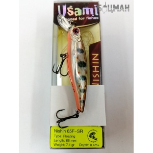 Воблер Usami Nishin 65F-SR, серия универсальных воблеров класса «минноу» для ловли на малых глубинах в любых водоемах.В конструкции применена магнитная система переноса массы, благодаря которой становится возможным дальний и точный заброс приманки практически в любых условиях.Применимы любые техники проводки, но лучшие результаты по щуке и окуню дает рывковая анимация.Хорошая устойчивость на течении позволяет успешно применять Nishin SR на быстротекущих мелких реках, где воблер используется в ловле лососевых.Отличные полетные качества при небольшом размере сделали его одной из любимых объемных приманок у любителей ловли жереха.
